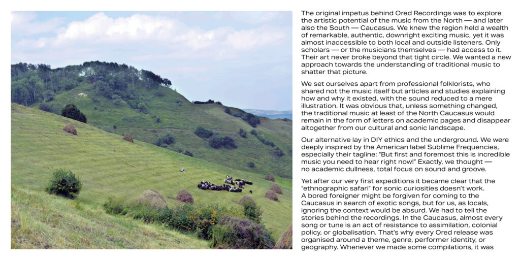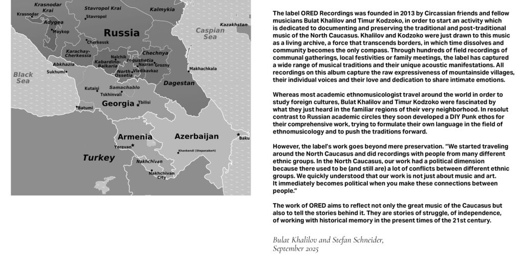The label ORED Recordings was founded in 2013 by Circassian friends and fellow musicians Bulat Khalilov and Timur Kodzoko, in order to start an activity which is dedicated to documenting and preserving the traditional and post-traditional music of the North Caucasus. Khalilov and Kodzoko, were just as excited about this music as it sounded like a force that transcends borders and in which time dissolves and community becomes the only compass.