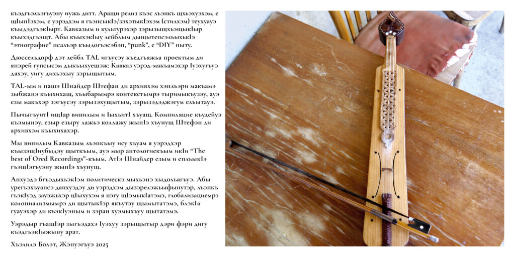 Whereas most academic ethnomusicologists travel around the world in order to study foreign cultures, Bulat Khalilov and Timur Kodzoko were fascinated by what they just heard in the familiar regions of their then home town Nalchik. In resolute contrast to Russian academic circles, they soon developed a DIY Punk ethos for their far reaching work, beginning to formulate their own language in the field of ethnomusicology and to push the traditions forward.
