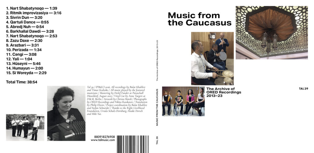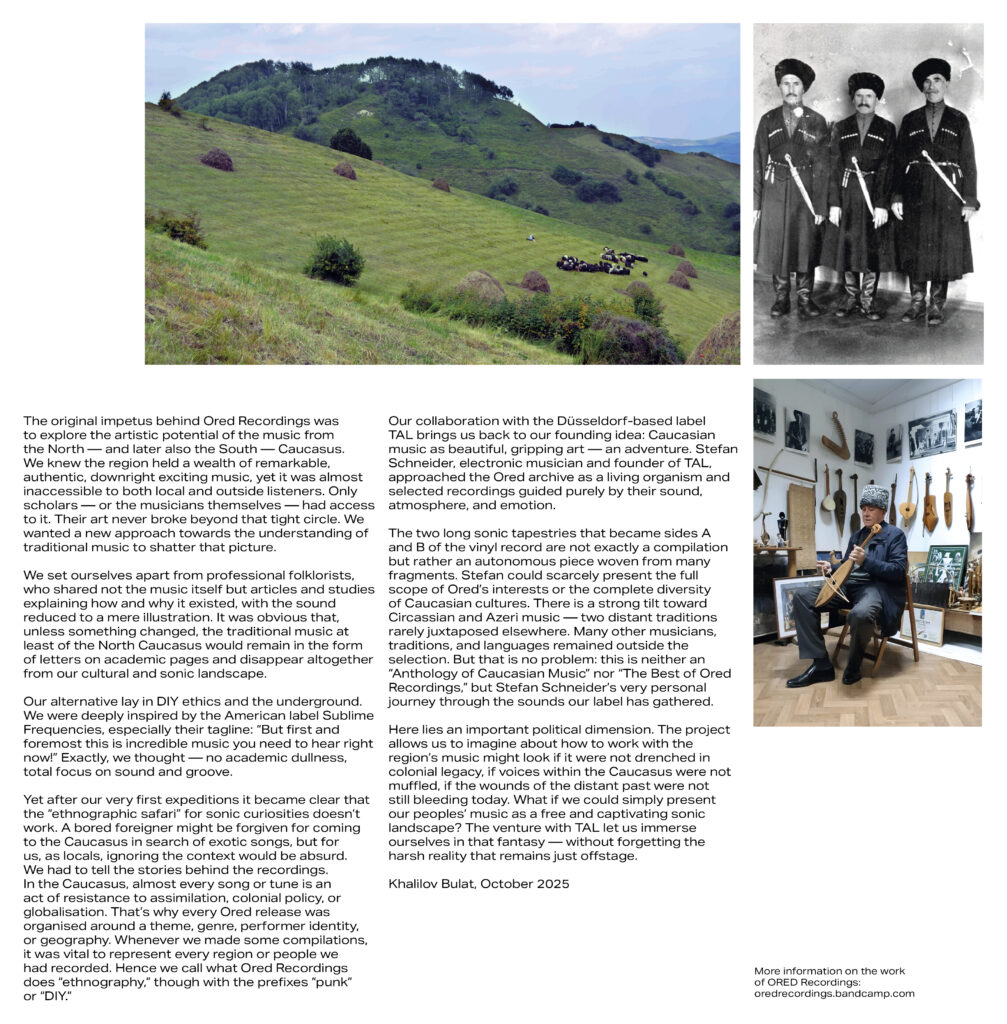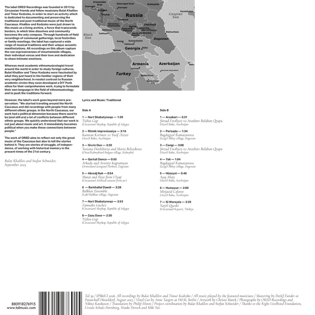 Since Bulat Khalilov and Timur Kodzoko are now based at the University of Göttingen, we were able to meet each other many times and to eventually exchange ideas which resulted in the release of this collection of recordings. The compilation »Music from the Caucasus« provides a first introduction to the comprehensive work of ORED Recordings. For this collaborative release on TAL the recordings are being made accessible for the first time ever on vinyl, CD and various digital formats, all coming with extensive liner notes and yet unpublished photographs.